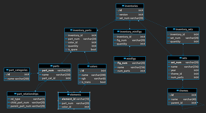 - colors.csv : couleurs LEGO (ID, noms, RGB, transparence).