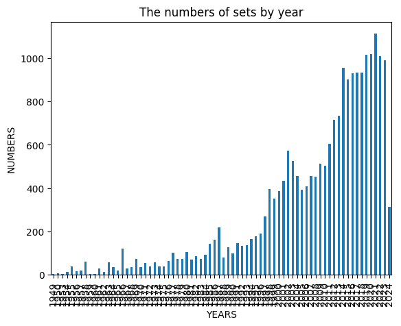 sets.groupby(‘year’)[’name’].nunique().plot(kind=‘bar’)