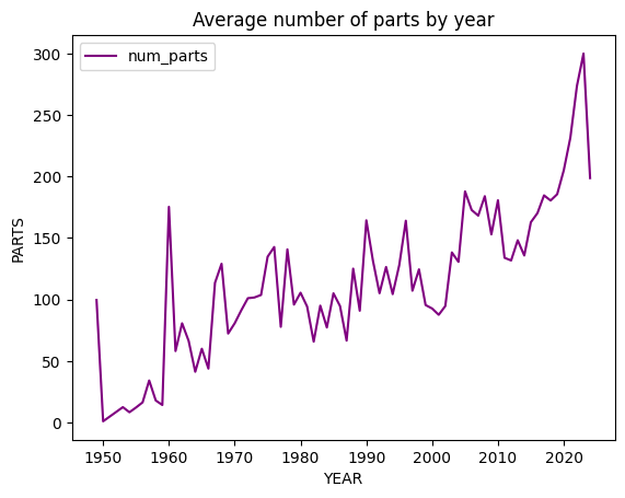 parts_by_year = sets[[‘year’, ’num_parts’]].groupby(‘year’, as_index=False).mean()