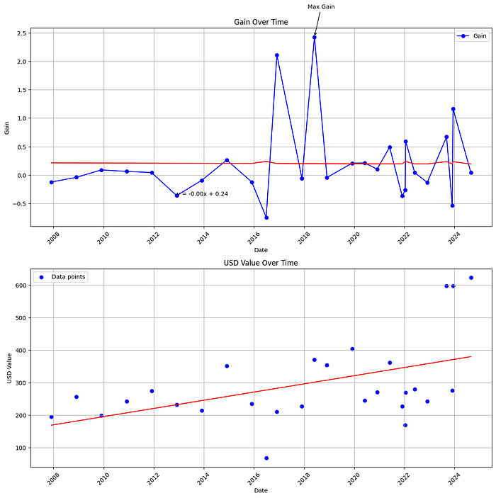 axes[0].text(df_0011[‘Date’].iloc[5], df_0011[‘Gain’].iloc[5], f’y = {slope:.2f}x + {intercept:.2f}’, fontsize=10, color=‘black’)