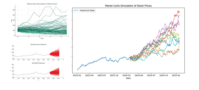 Le Monte Carlo par chaînes de Markov (MCMC), comme dans l’article de Landauskas et Valakevičius sur la modélisation des cours, est un autre outil : il tire des échantillons d’une loi qui n’a pas à être gaussienne simple — par exemple construite par estimation par noyau des prix observés — alors que le code ci-dessous suppose des chocs log-normaux à partir de dérive et volatilité estimées. Un flux pratique est MCMC (ou autre inférence) pour la loi des données, puis Monte Carlo forward pour les scénarios multi-périodes. Ce billet implémente explicitement le pas GBM forward ; voir les références et le lien WIP ci-dessous pour aller vers du MCMC « papier ».