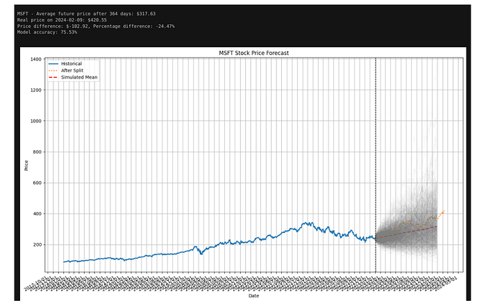 mc_prices = monte_carlo_simulation(prices_before_january_2023[‘Close’], simulation_days, mc_iterations)